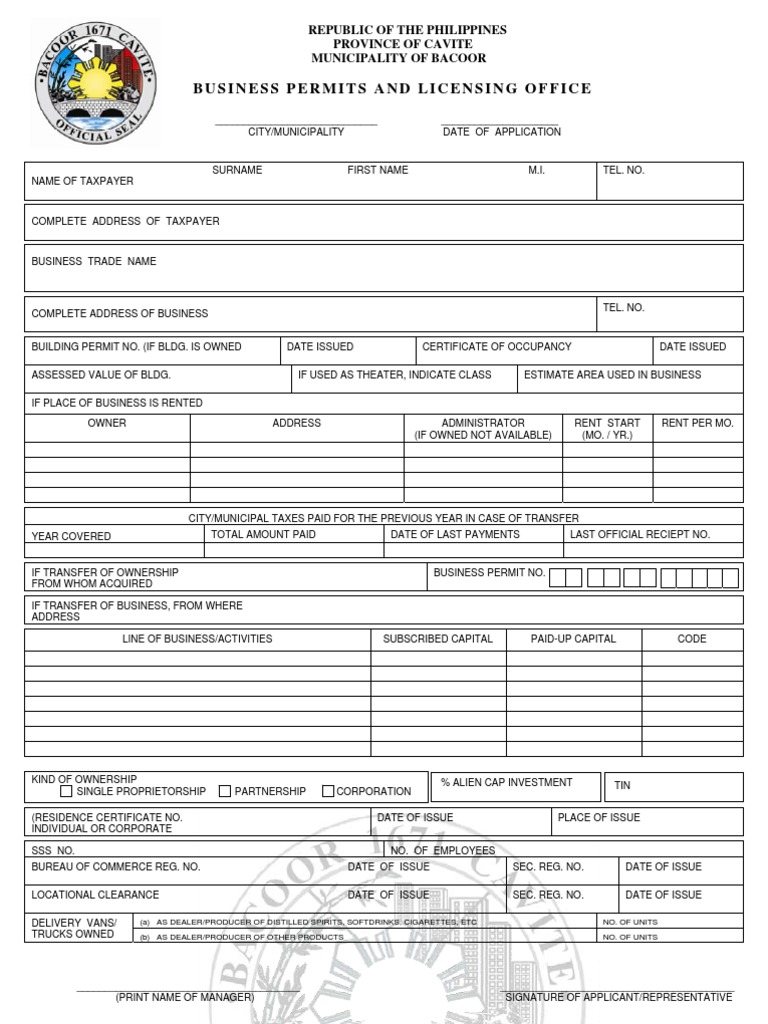Business permit application form bacoor cavite. Bacoor Disaster Risk Reduction and Management Office BDRRMO 046 417-0727 Philippine National Police-Bacoor City PNP 046 417-6366 Bureau of Fire Protection-Bacoor City BFP 046 417-6060 City Information Office 046 481-4120. Submit your form together with the requirements for assessment. Deposit or Transfer Payment On-line.